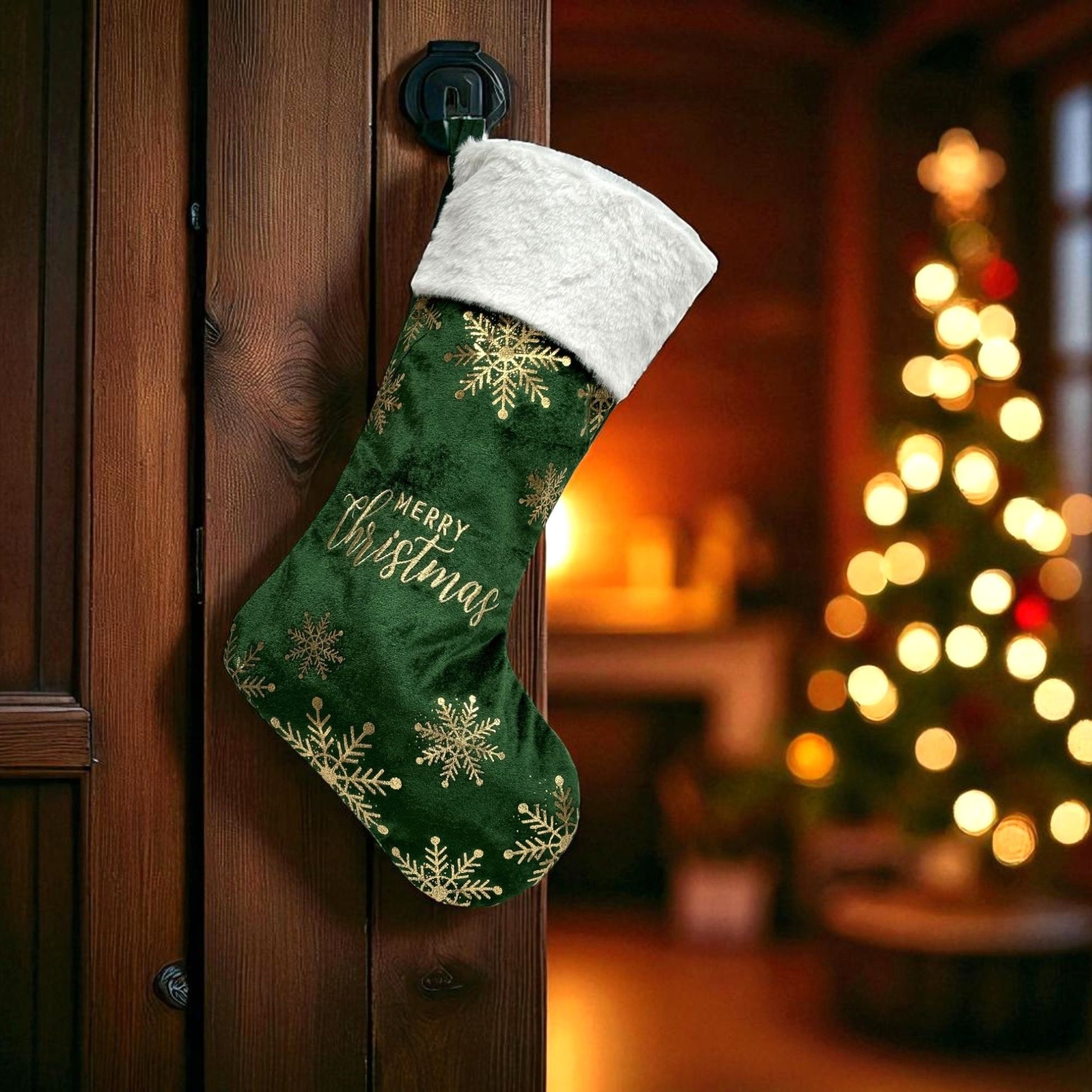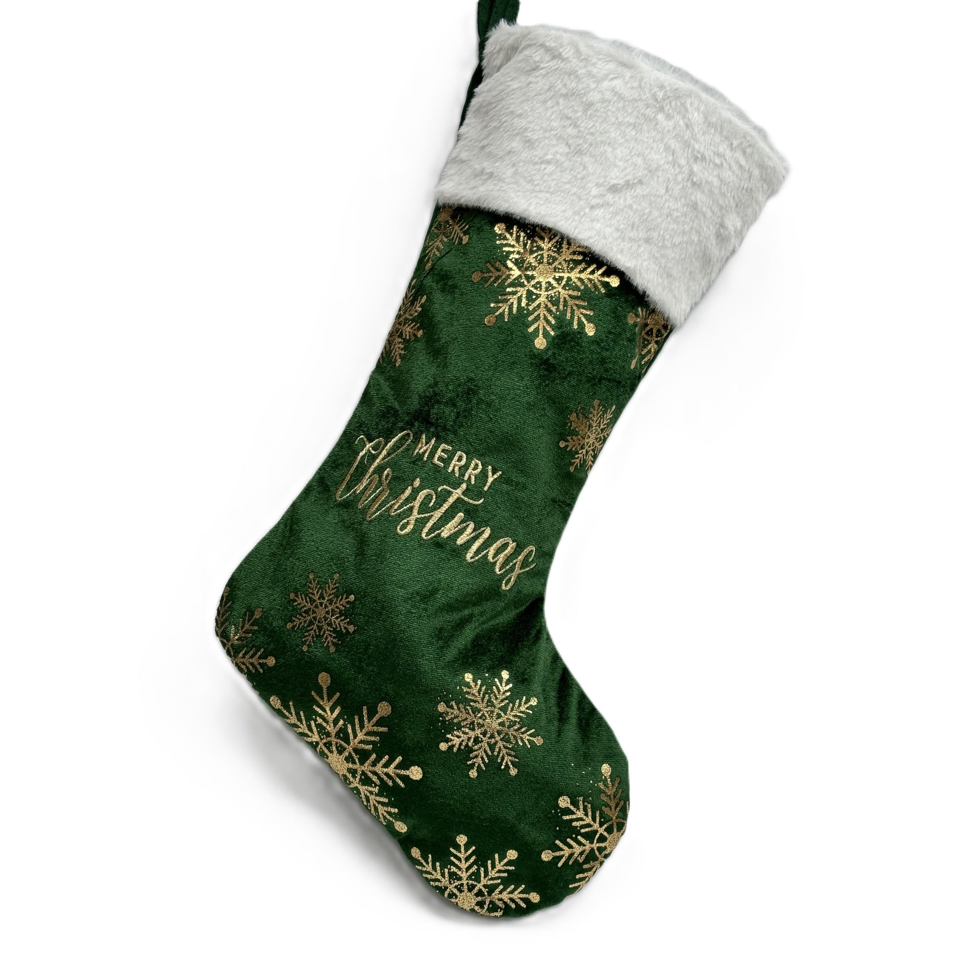 En mörkgrön julstrumpa med text i guld ger en klassisk och sofistikerad känsla till juldekorationerna. Den djupa gröna färgen skapar en elegant bakgrund som gör att den guldiga texten och snöflingorna framträder. Häng den på spiselkransen eller på en vägg och fyll den med små söta julklappar.