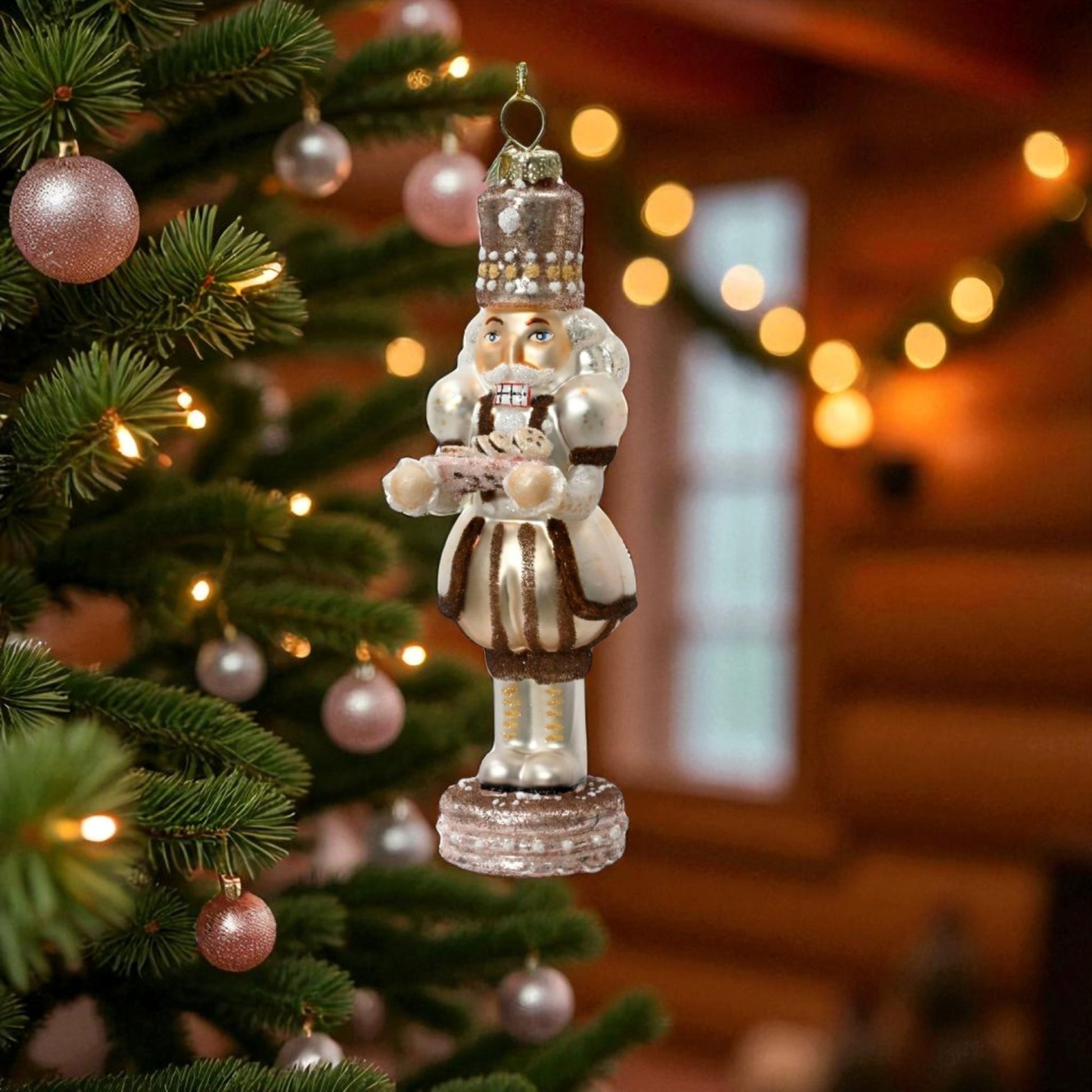 Skapa en sofistikerad och magisk julgran med vår julgransprydnad utformade som nötknäppare i färgerna Blush Pink, Light Gold och Oxred. Den här eleganta och charmiga prydnaden tillför en känsla av lyx och tradition till din juldekoration och dess fina färgkombinationer skapar en modern och stilfull look. Nötknäppare stående på en macron.