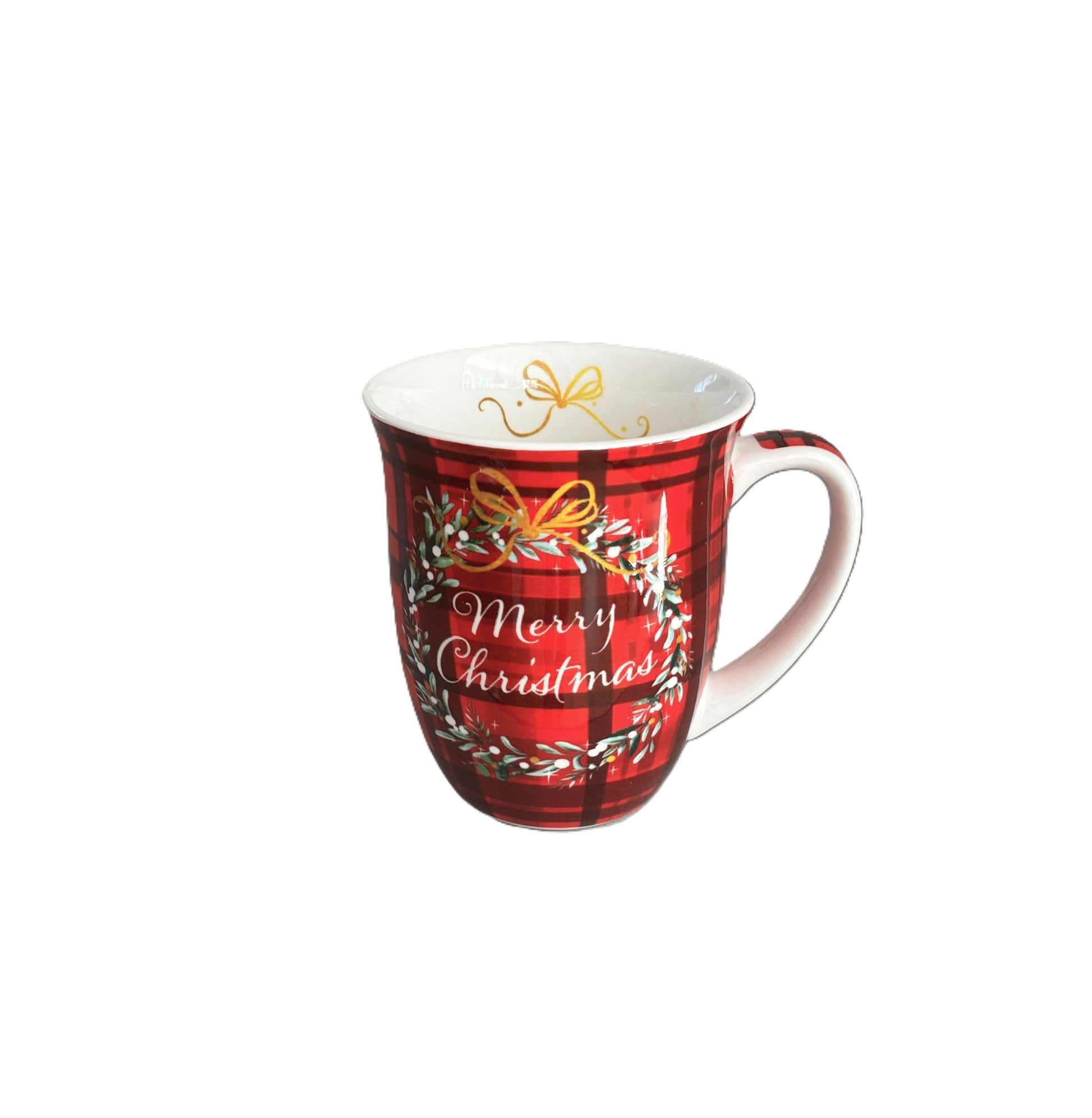 Den här julmuggen har en klassisk design med sitt rödrutiga mönster och motiv av en julkrans. Det tidlösa mönstret skapar en nostalgisk och hemtrevlig atmosfär som passar perfekt till julens glädje och traditioner. Färgen är Pleid Red och kan matchas med servetter för en enhetlig dukning till frukosten eller julfikat.