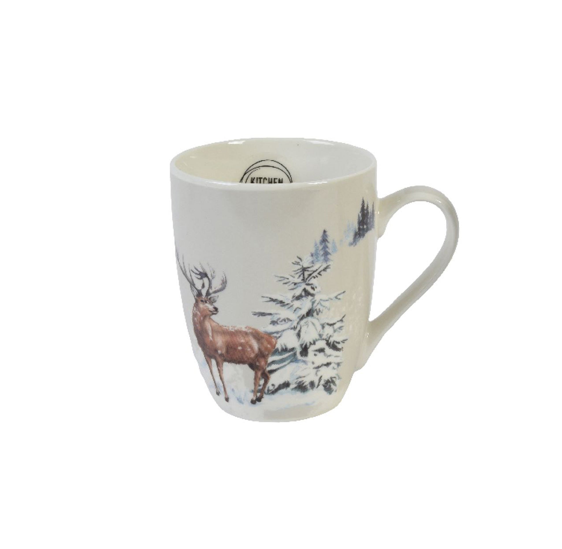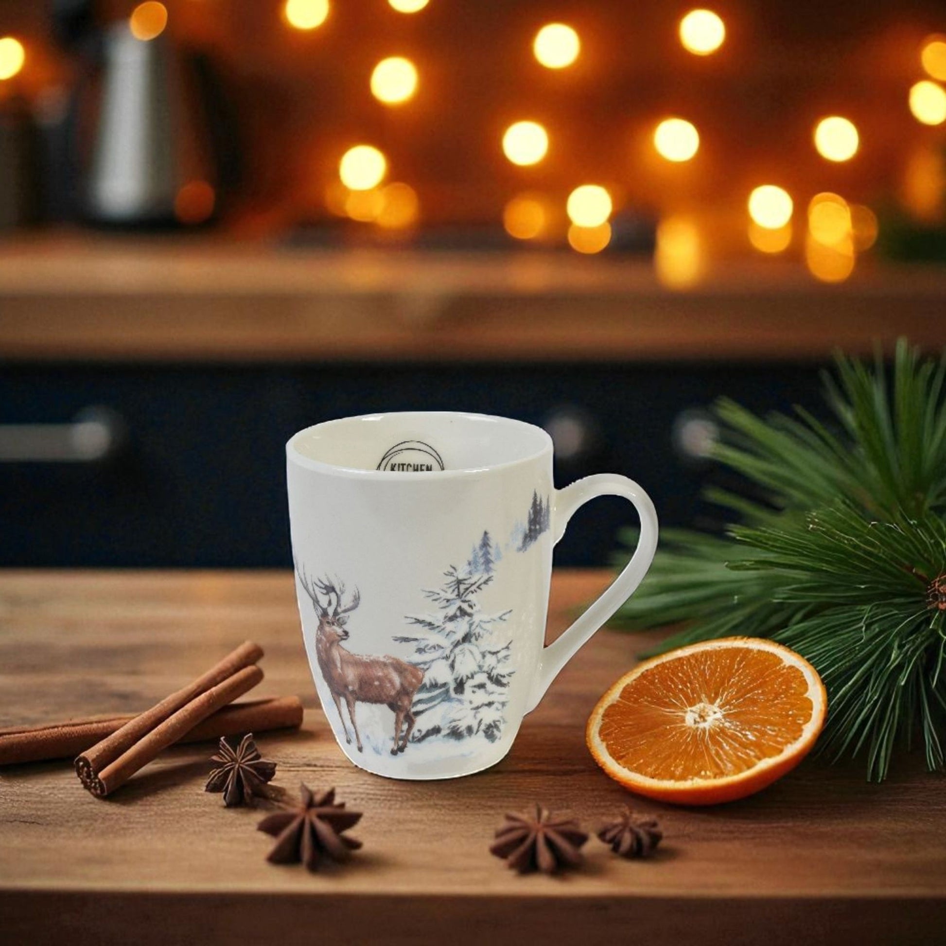 Förgyll dina vintermorgnar med vår eleganta vita mugg, dekorerad med ett motiv av en hjort och en vintrig gran. Muggen fångar naturens skönhet och sprider en känsla av ro och frid under den kalla säsongen.