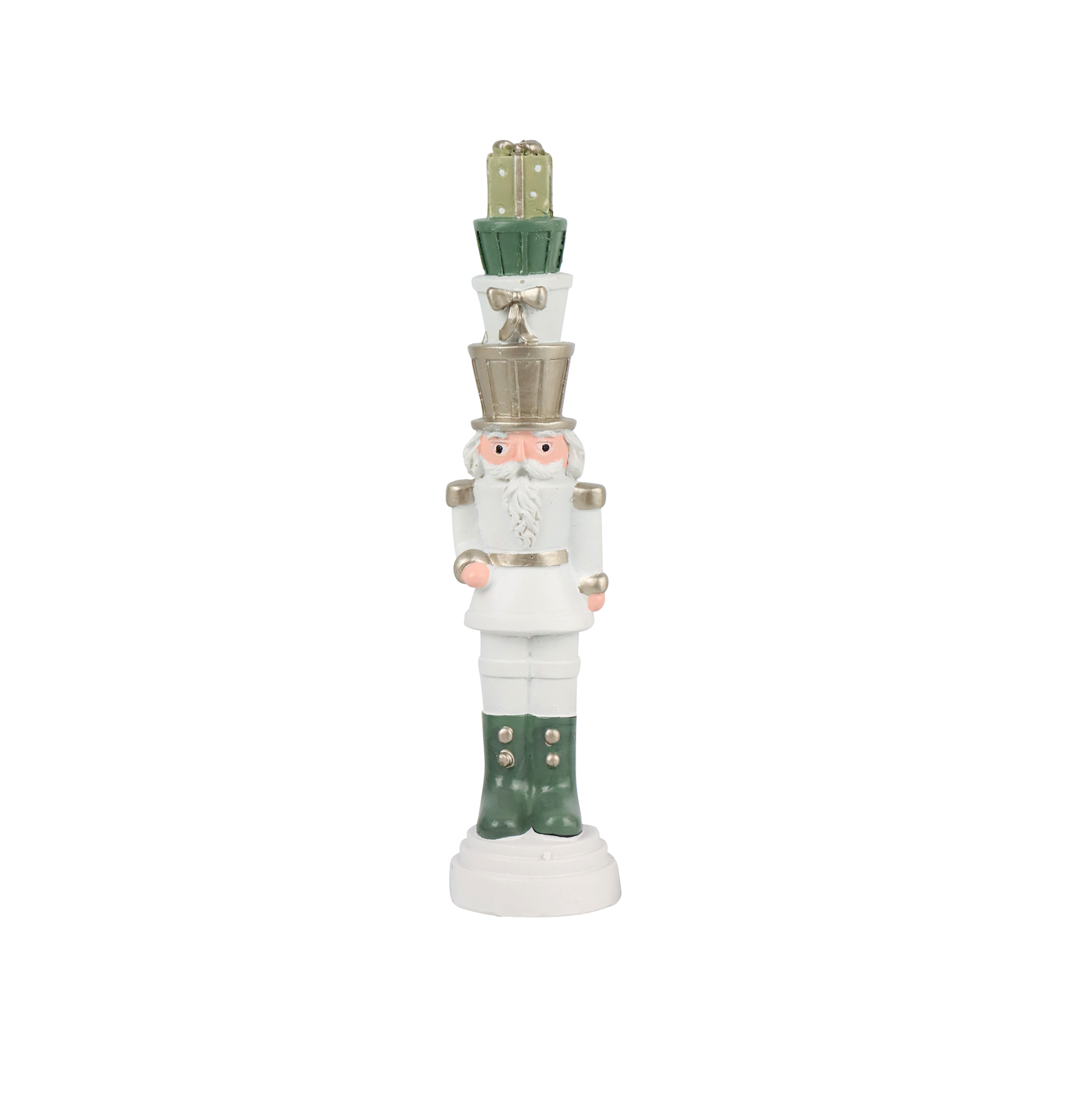 En elegant vit och silverfärgad Nötknäppare, dekorerad med en julklappar på huvudet, stående stolt på en rund bas. Perfekt som klassisk juldekoration.