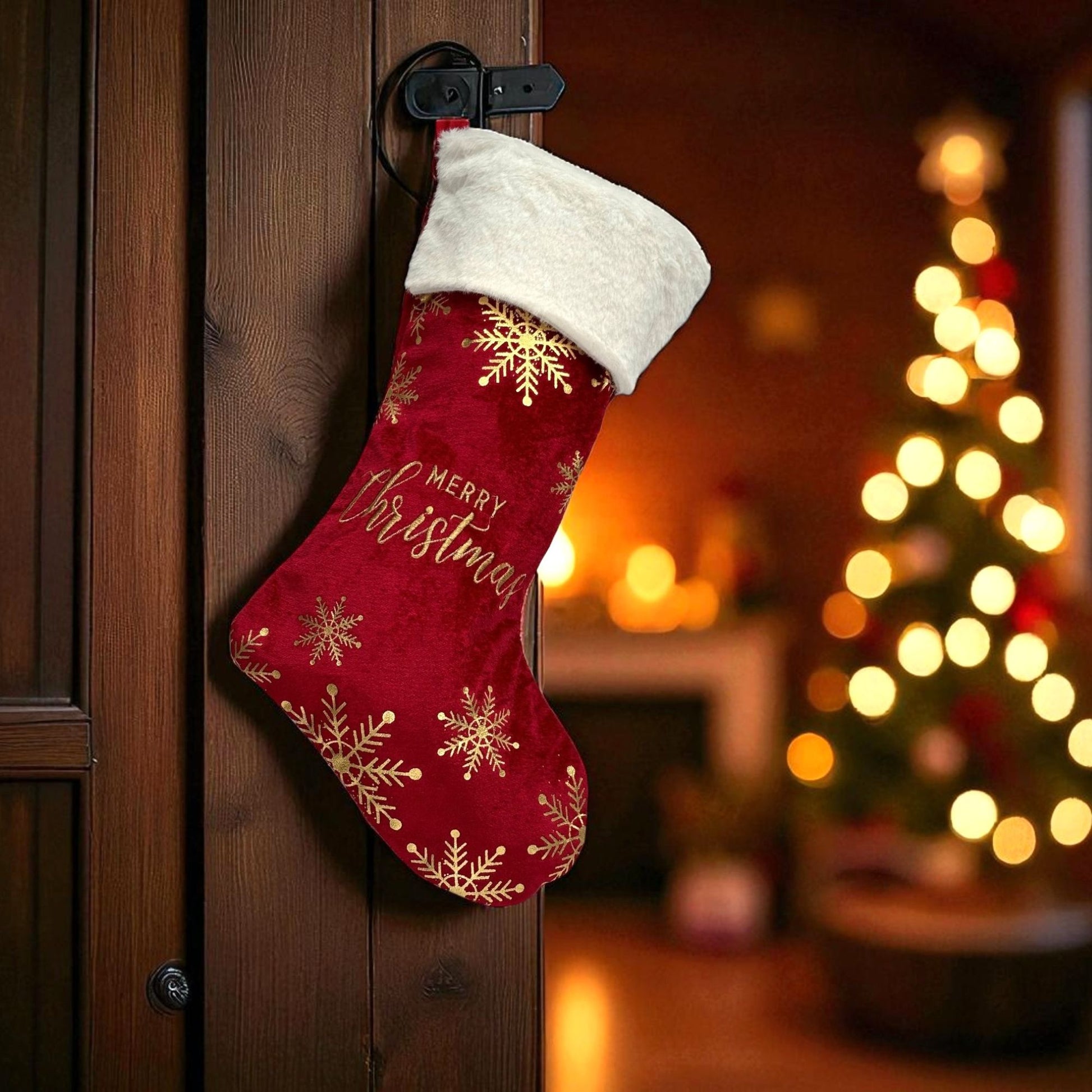 En röd julstrumpa med guldig text är en klassisk och fin dekoration som utstrålar julens värme och glädje. Den djupa röda färgen är starkt förknippad med julen och skapar en härlig kontrast till den glittrande texten i guld. Häng den på spiselkransen eller på en vägg och fyll den med små söta julklappar.
