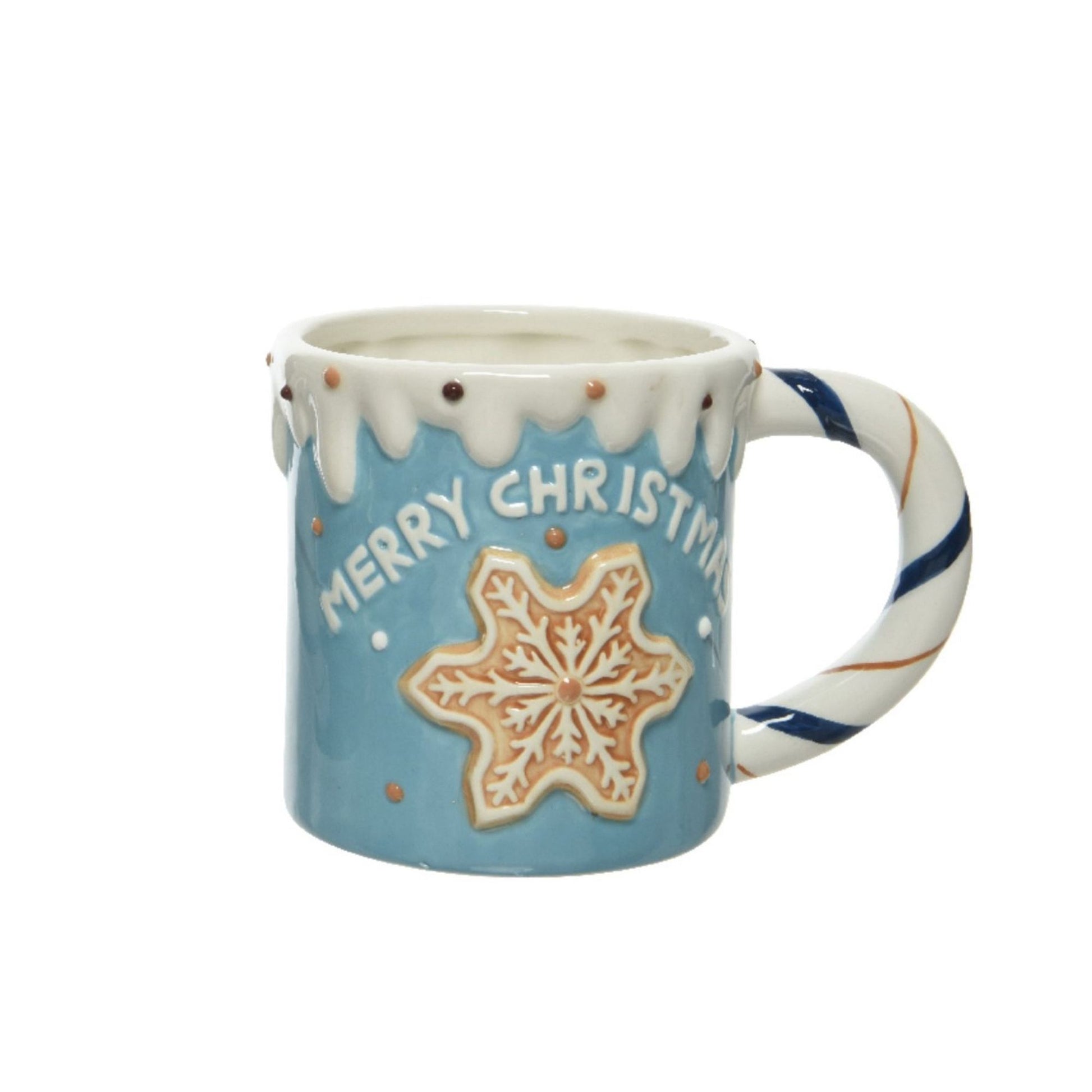 Vår ljusblå julmugg erbjuder en fin design med sin mjuka blå färg och detaljerade dekoration av en pepparkaka formad som en snöflinga på framsidan. Pepparkakssnöflingan med sina vackra glasyrdetaljer, skapar en nostalgisk och mysig atmosfär som passar perfekt till julens glädje och traditioner. Produkten är handgjord och kan därför variera något i utseende.