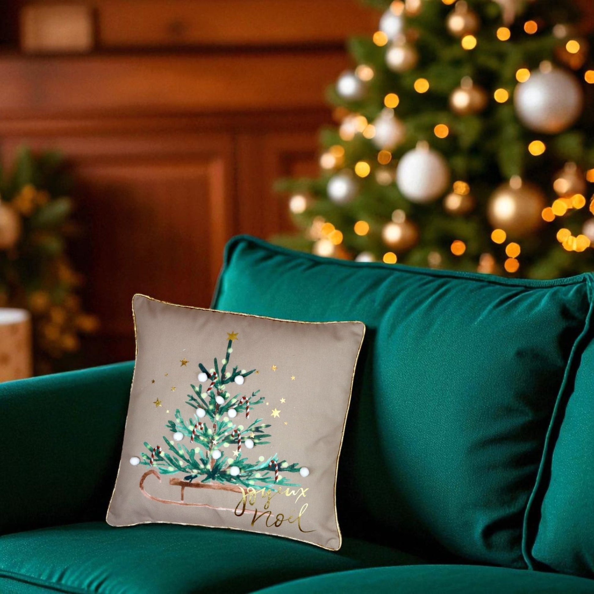 Med sin gröna gran, jordnära färger och små vita bollar som imiterar snö fångar kuddfodralet känslan av vinter i naturen. Passar lika bra i soffan, fåtöljen eller sängen för att skapa en varm och inbjudande atmosfär.