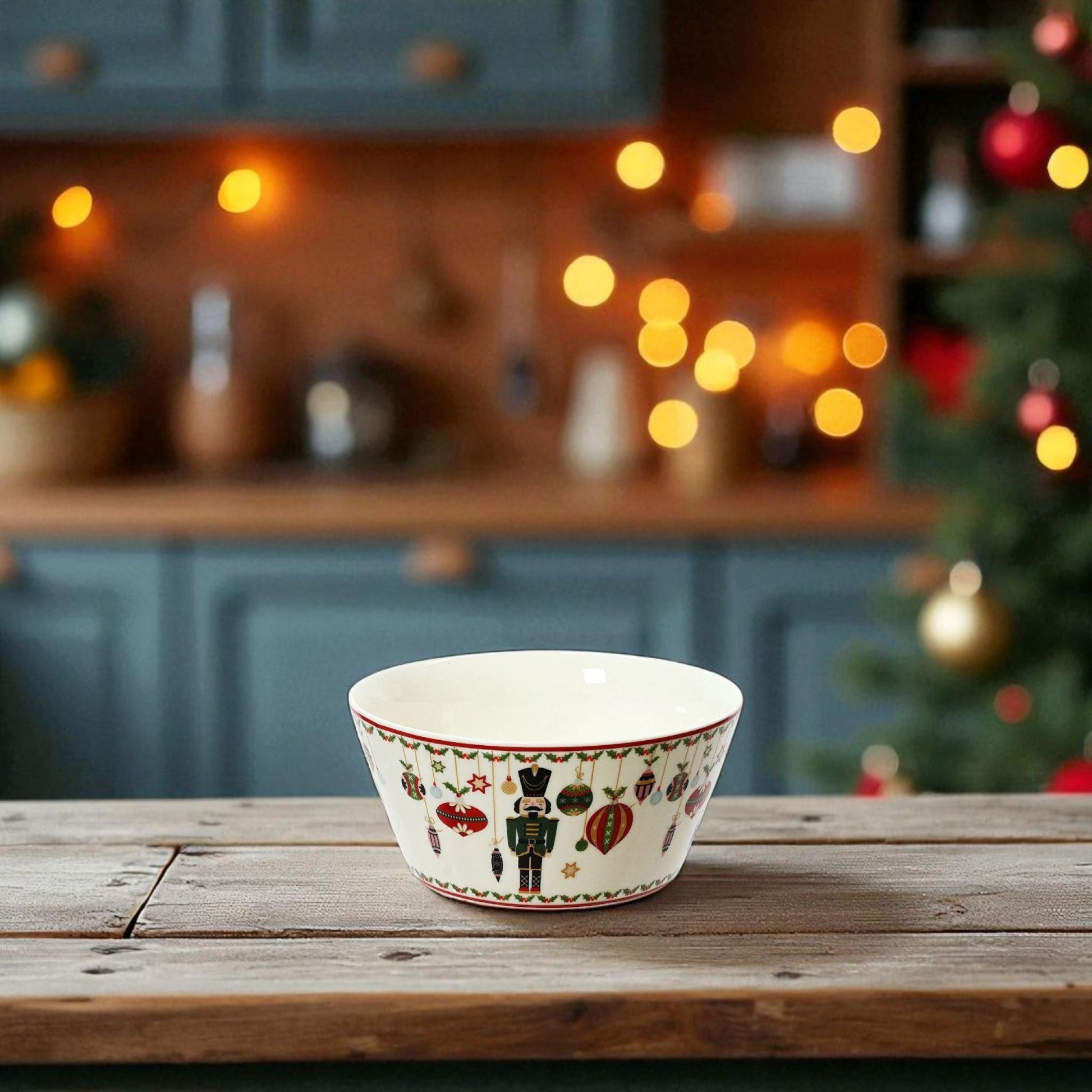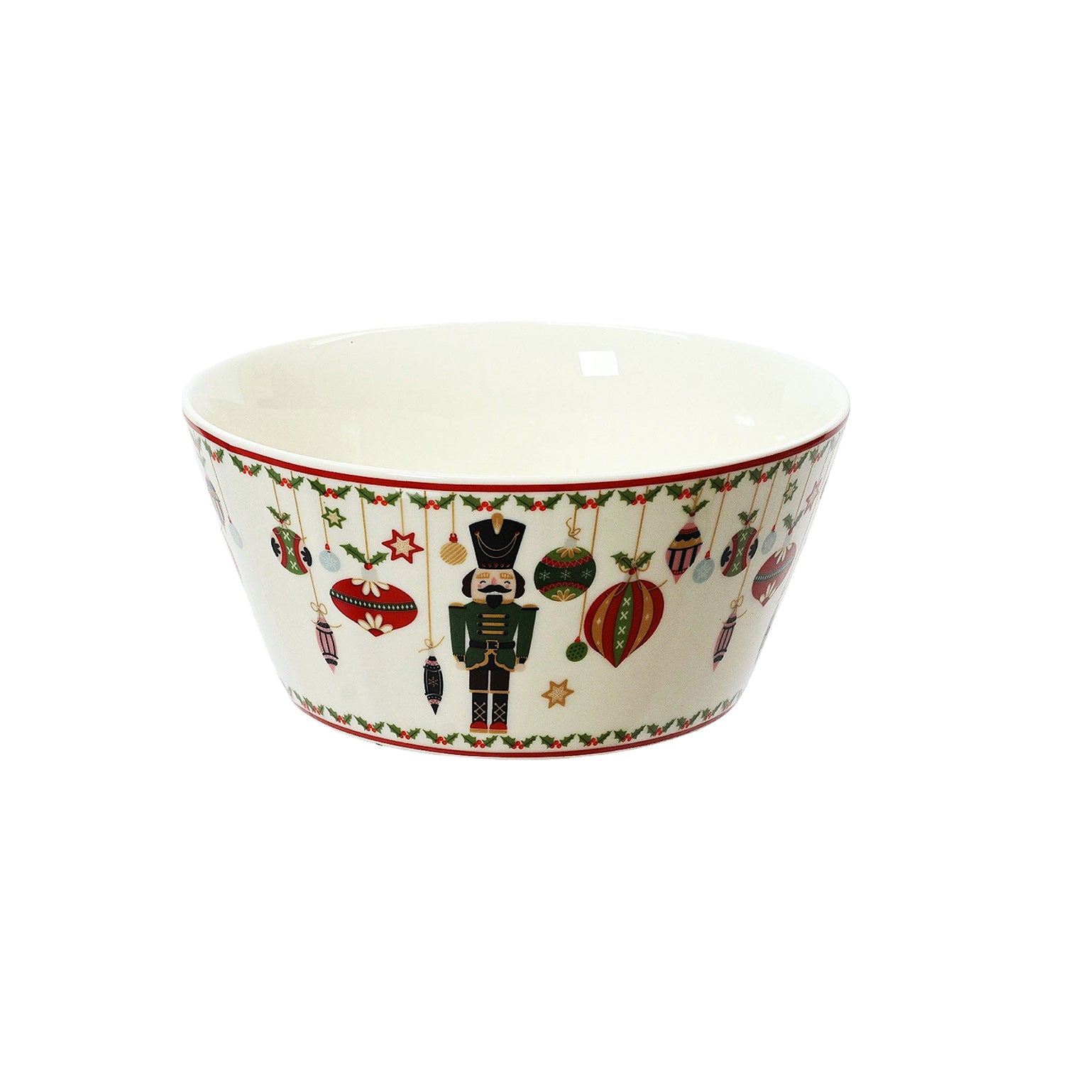 Porslinsskål med festligt julmotiv av nötknäppare, kulor och stjärnor. Perfekt för julgodis, nötter eller andra små rätter på julbordet.